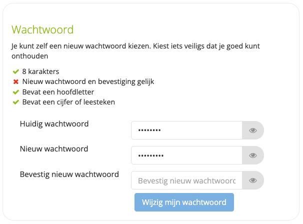Het kiezen van een nieuw wachtwoord is nu wat duidelijker geworden. Je ziet nu in het portaal en de App waar een wachtwoord aan moet voldoen en of dat nu ook al zo is.