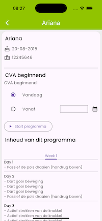 Bij het starten van een oefenprogramma kun je kiezen uit verschillende beschikbare programma’s en bepaal je zelf het moment van starten. Je kunt het programma direct laten starten of alvast klaarzetten voor een later moment, zodat dit goed aansluit op de planning van de behandeling.