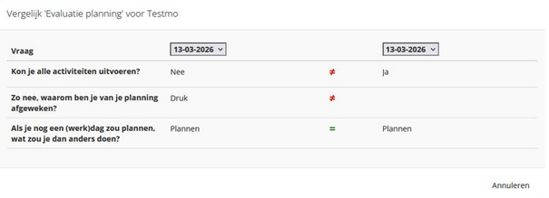 In samenwerking met het Roessingh is het nu mogelijk om antwoorden van twee ingevulde vragenlijsten van een patiënt met elkaar te vergelijken.Deze functionaliteit is ontstaan vanuit een vraag binnen de nazorg, waarbij er behoefte was aan meer inzicht in veranderingen over tijd. Hiermee krijg je in één oogopslag inzicht in de verschillen en overeenkomsten tussen twee meetmomenten. De vergelijking wordt overzichtelijk weergegeven, waarbij per antwoord met de symbolen = en ≠ direct zichtbaar is of antwoorden gelijk zijn gebleven of juist veranderd zijn. Zo wordt het eenvoudiger om veranderingen in de tijd te signaleren en deze samen met de patiënt te bespreken binnen de behandeling.