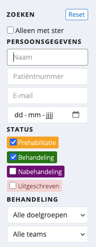 Daarnaast is het nu mogelijk om te zoeken op e-mailadres en geboortedatum in de lijst van Mijn patiënten, naast de bestaande filters zoals naam en patiëntnummer. Dit maakt het eenvoudiger en sneller om de juiste patiënt te vinden.